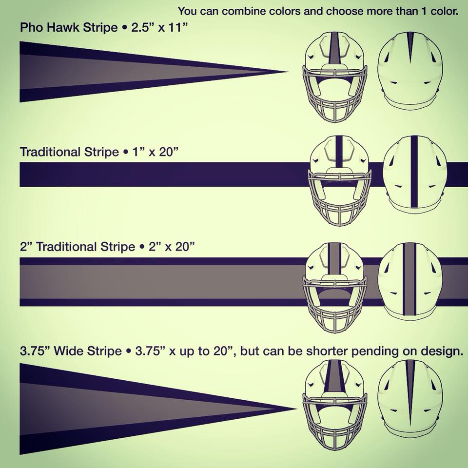 Our helmet decals stripes are subsurface printed on clear 20mil thick vinyl. They're the toughest most durable decal you can buy and designed for perfect conformability. Standard decal stripes measure approximately 1/2” - 2”, but each design is different. We understand that not every design is a straight stripe and do custom stripes