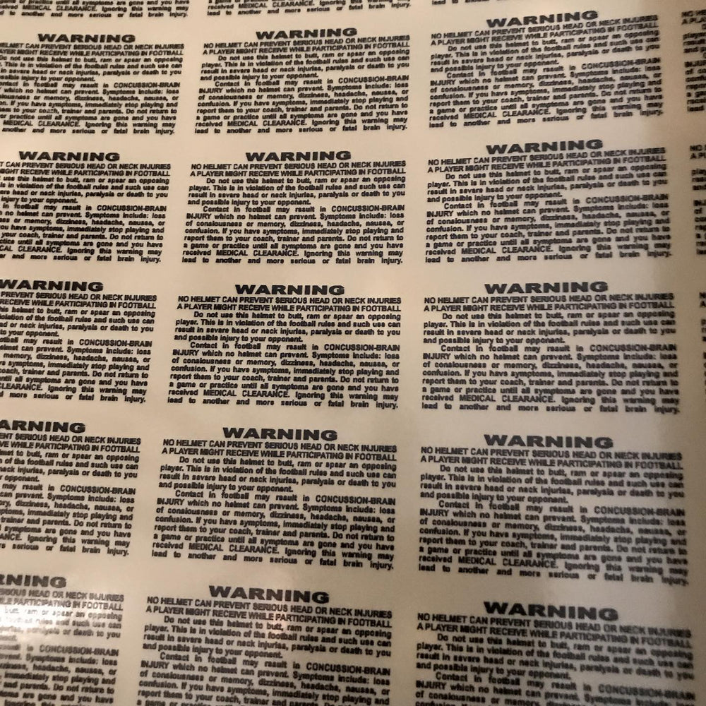 Need to replace a warning sticker for your football helmets? Order our high quality 20 mil vinyl warning decals to last you multiple seasons. Warning decals can be printed with the text and background in any of our stock colors. Please indicate when ordering.